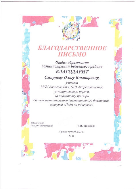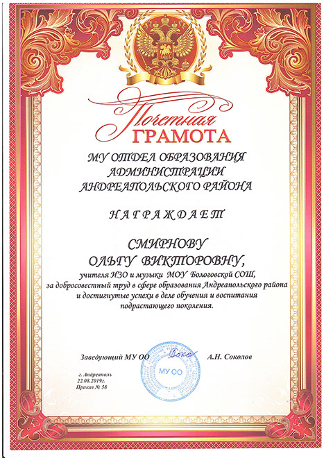 Меня зовут Смирнова Ольга Викторовна. Я работаю учителем изобразительного искусства в Бологовской школе уже 8 лет. Образование: